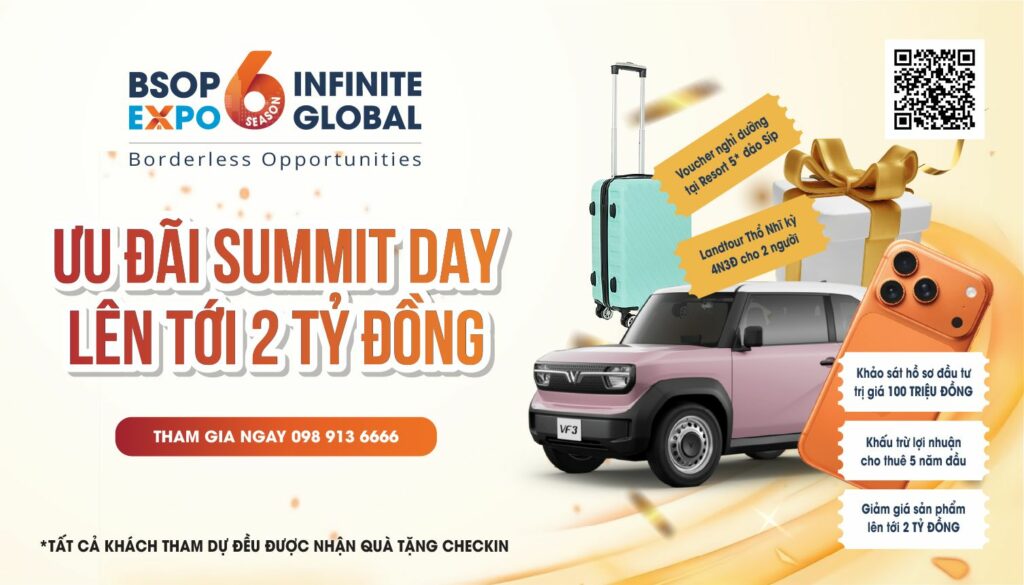 Summit Day, sự kiện tâm điểm trong chuỗi BSOP EXPO 6, đang trở thành điểm hẹn đáng mong chờ nhất của giới đầu tư Việt Nam. Không chỉ quy tụ các chuyên gia quốc tế hàng đầu, sự kiện còn mang đến hàng loạt phần quà giá trị như iPhone 17 Pro Max, xe VinFast VF3, landtour Thổ Nhĩ Kỳ, voucher nghỉ dưỡng 5 sao tại châu Âu… cùng chính sách ưu đãi đầu tư độc quyền lên tới 2 tỷ đồng dành riêng cho khách tham dự và ký hợp đồng ngay tại chương trình.