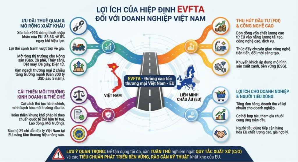 Đối với nhà đầu tư và doanh nghiệp Việt Nam, Hiệp định Thương mại Tự do Việt Nam – EU (EVFTA) có hiệu lực từ năm 2020 đã mở ra nhiều cơ hội xuất khẩu với việc xóa bỏ gần 99% thuế quan. Năm 2026, kim ngạch thương mại Việt-EU dự kiến đạt mức kỷ lục, tạo động lực mạnh mẽ cho các doanh nghiệp mở rộng thị trường.