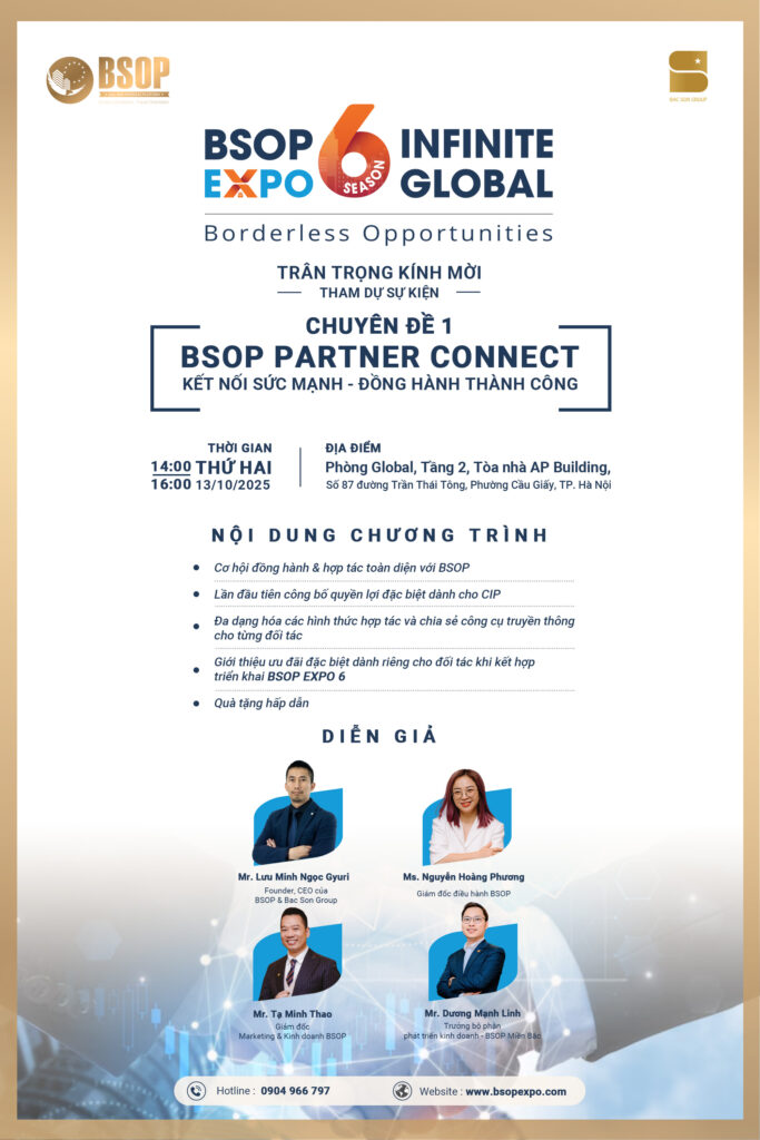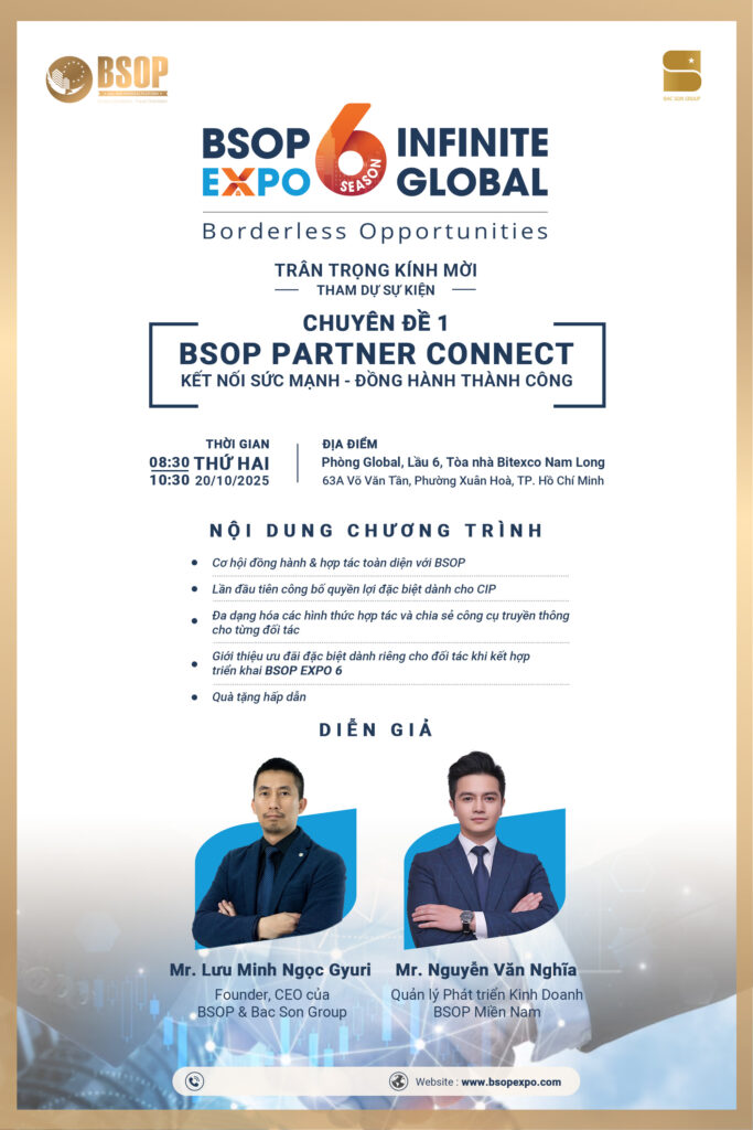 Chuỗi sự kiện EXPO 6 sắp diễn ra với điểm nhấn đặc biệt là chương trình BSOP Partner Connect, nơi các doanh nghiệp và đối tác cá nhân có thể thiết lập quan hệ hợp tác chiến lược toàn diện với BSOP.