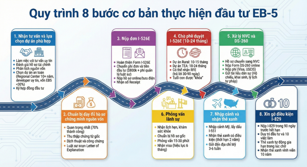Trong bối cảnh chính sách di trú Mỹ liên tục thay đổi, việc nắm bắt thông tin chính xác về chương trình EB-5 năm 2025 trở nên cực kỳ quan trọng. Bài viết này sẽ cung cấp cho bạn cái nhìn toàn diện về visa định cư Mỹ diện EB-5, từ điều kiện cơ bản, quy trình nộp hồ sơ, lựa chọn dự án EB-5, đến các quyền lợi nhà đầu tư vượt trội. Đây là nguồn thông tin thiết yếu giúp bạn đưa ra quyết định đầu tư định cư thông minh và hiệu quả nhất.