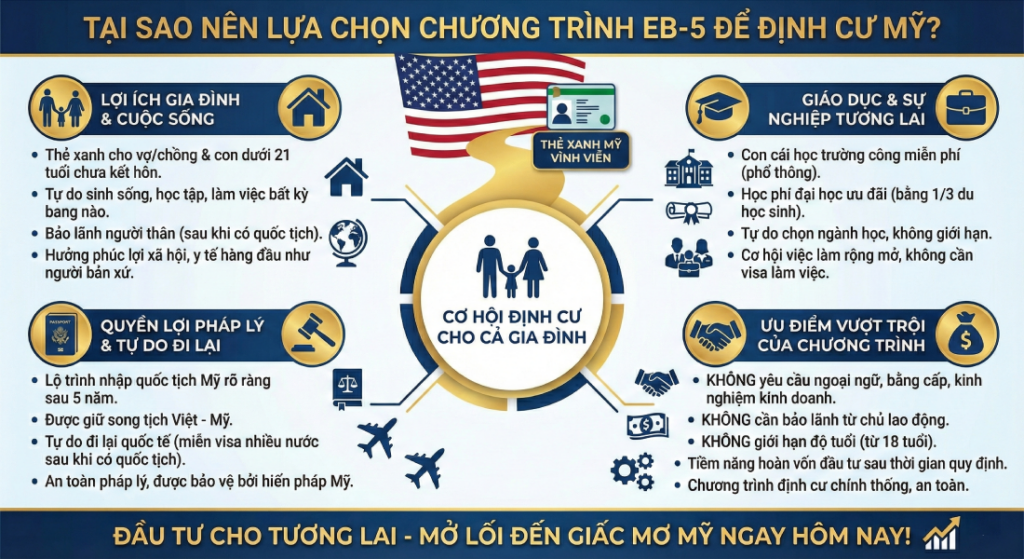 Định cư Mỹ EB5 là con đường hợp pháp, minh bạch để cả gia đình nhận thẻ xanh thường trú nhân Mỹ. Dù quy trình mất 3-5 năm và chi phí không nhỏ (100-160K USD ngoài 800K vốn), đây vẫn là lựa chọn tối ưu cho những ai: