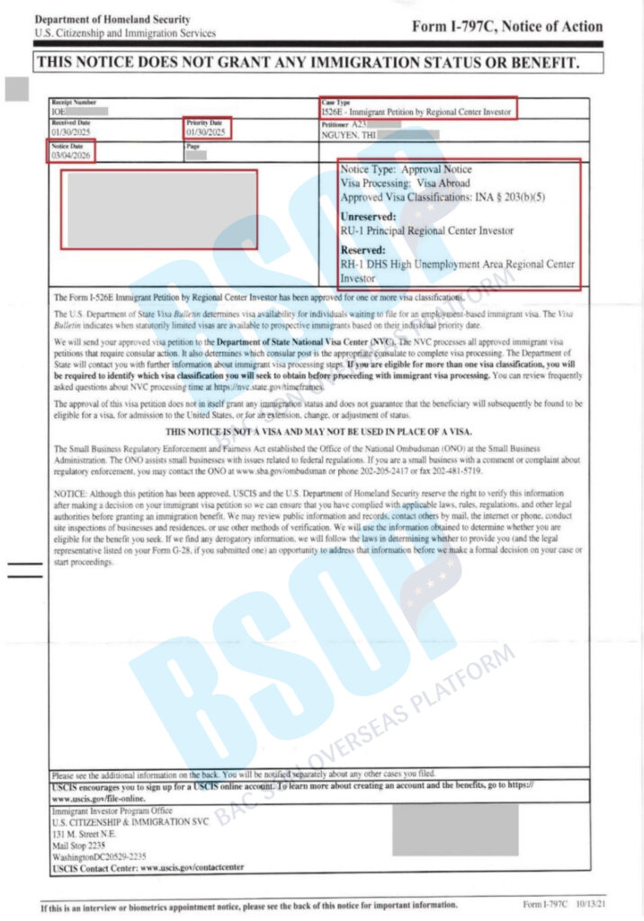 Chúc mừng Nhà đầu tư EB-5 của BSOP đã chính thức nhận được chấp thuận đơn I-526E từ USCIS. Đây là cột mốc quan trọng trong quy trình để nhà đầu tư và gia đình nhận được Thẻ xanh Mỹ.