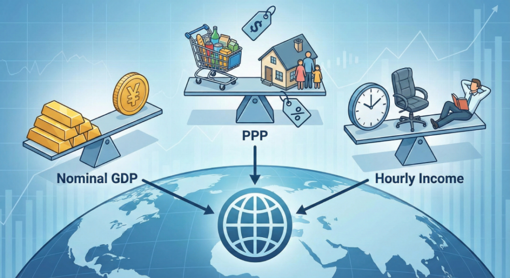 Ví dụ, Luxembourg dẫn đầu theo GDP danh nghĩa với 143.000 USD/người, nhưng Singapore có thể vượt trội hơn khi tính theo PPP do chi phí sinh hoạt thấp hơn so với sức mua thực tế. Na Wy dẫn đầu về thu nhập theo giờ với 80 USD/giờ, phản ánh chất lượng công việc cao và cân bằng cuộc sống-công việc tốt.